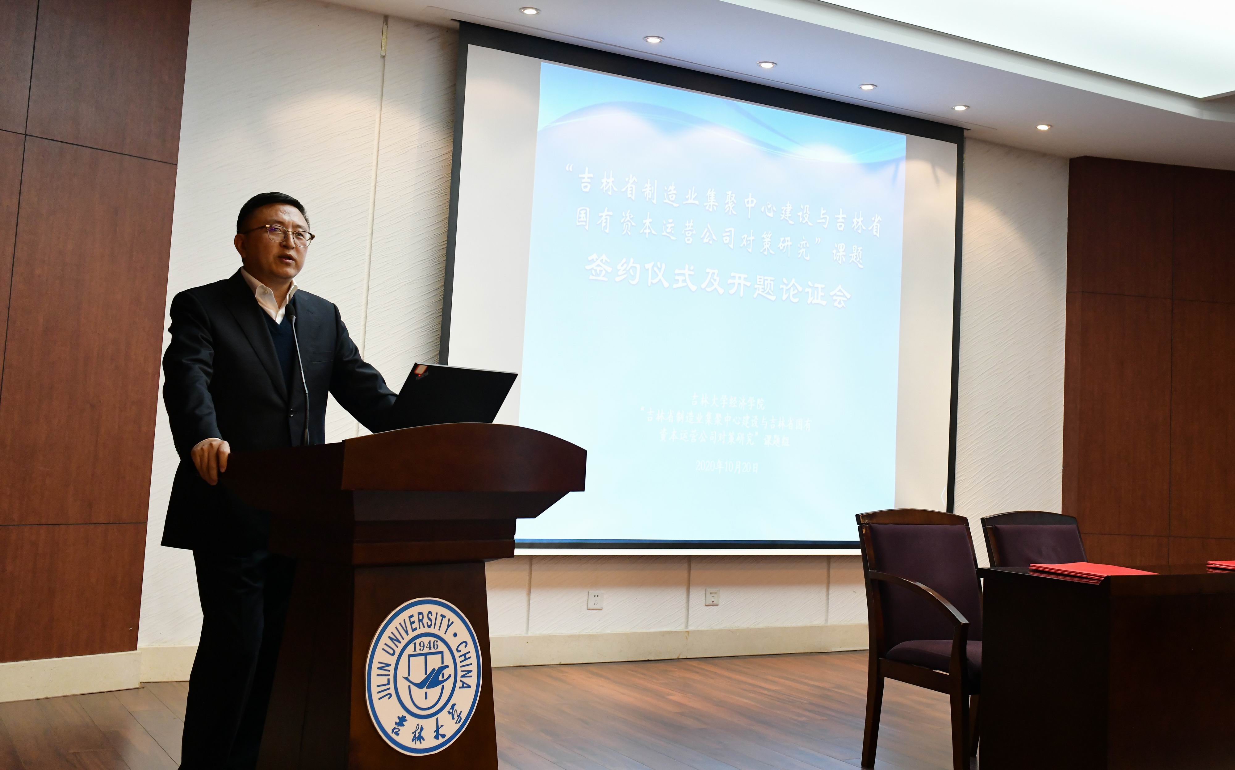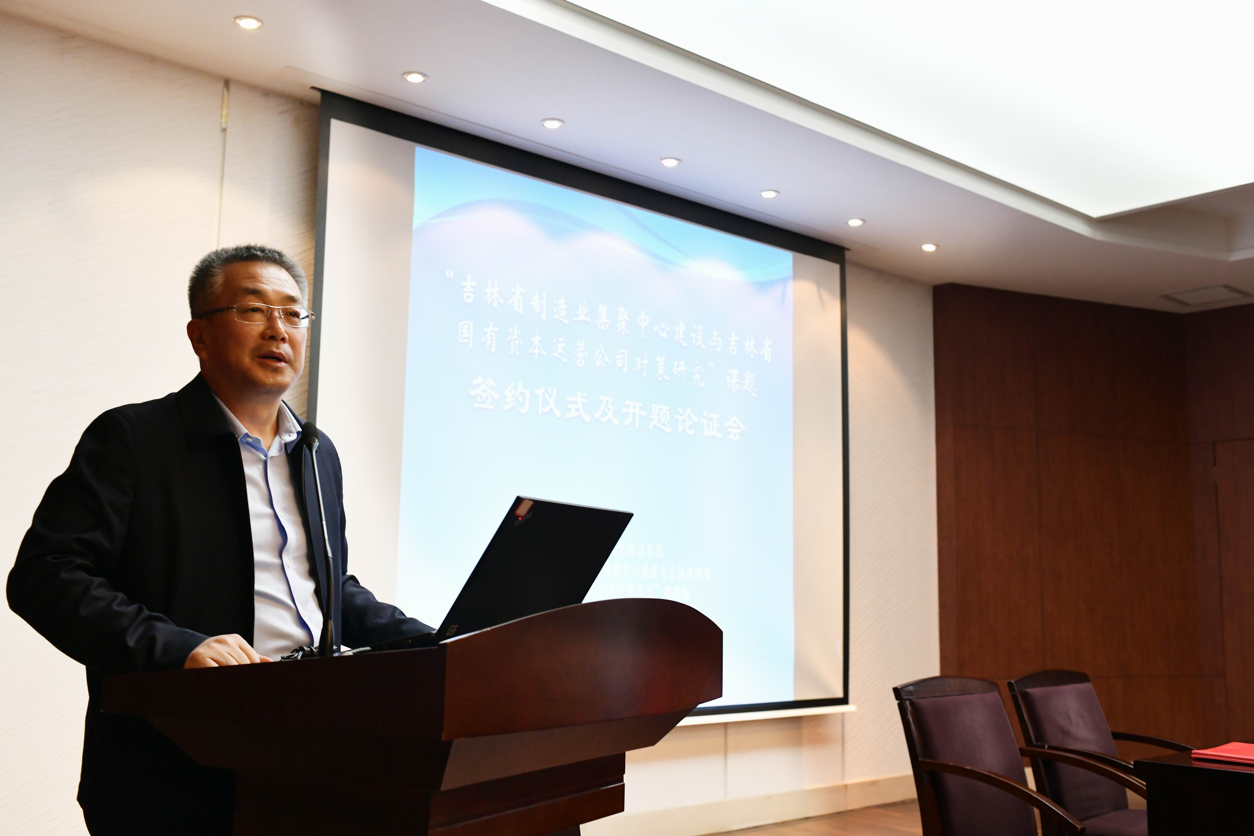 院长、“吉林省制造业集聚中心建设与吉林省国有资本运营公司对策研究”课题负责人李晓教授主持。吉林大学副校长蔡立东教授首先致辞,对本次课题的重要性和研究意义给予了高度肯定,并阐述了吉林大学在横向课题研究方面,所具备的信息优势、视野优势、理论优势。吉林省国有资产监督管理委员会王刚副主任,在致辞中提出对课题研究的期望,包括如何做好吉林省制造业发展的战略定位、如何充分论证吉林省建设制造业集聚中心所具备的优势等,并对本次课题的研究成果寄予厚望。