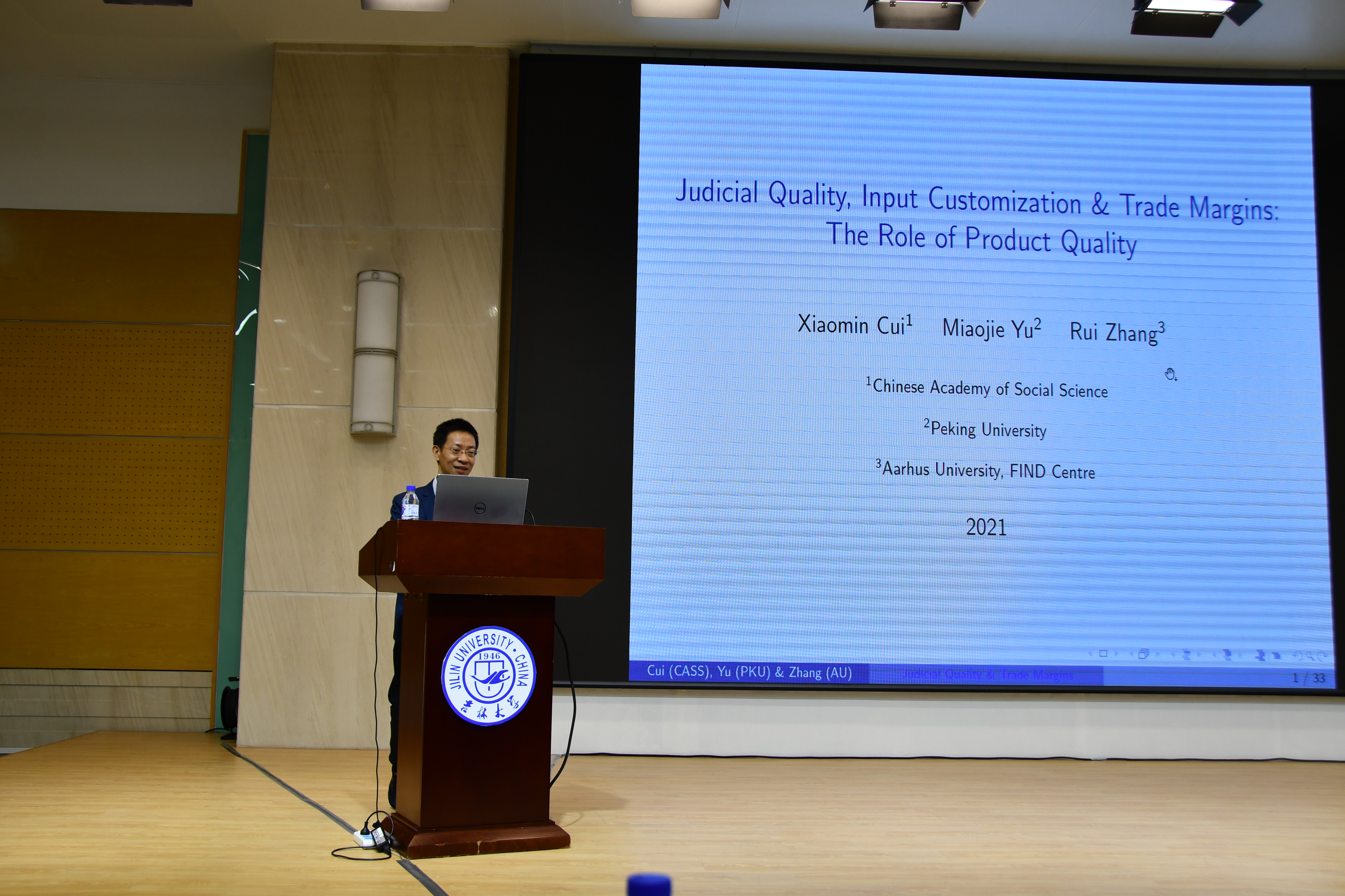 余淼杰老师系北京大学博雅特聘教授、国家杰出青年基金获得者。现任北京大学国家发展研究院党委书记、副院长;国际中国研究联盟秘书长、黄廷芳/信和青年杰出学者、北京市卓越青年科学家、全球经济管理类前1%高引论文经济学家。主要研究领域为国际贸易和中国经济发展。曾在国内外顶级一流期刊上发表论文150多篇,出版中英文专著、教材、时评随笔十余部。余淼杰教授在讲座中分享了其最新研究成果。其研究认为,良好的契约环境和司法质量,一方面将使得一国在出口密集使用定制化投入品的行业上具有规模意义上的比较优势。另一方面,良好的契约环境和司法质量,还将通过提高国内市场竞争程度,促进本国产品的质量升级,进而影响该国在合约密集型行业上的贸易质量构成。余淼杰教授指出,在经典的李嘉图模型中,引入定制化投入品的专用度差异和产品质量决策过程,能够刻画上述典型事实及其作用机制。在此基础上,余淼杰教授及其合作者利用UN Comtrade数据库中198个国家、1186个SITC-4位码和度量单位产品组合的跨国数据,验证了国家层面司法质量与不同合约密集型行业的贸易模式、贸易品价格和质量的理论关系。