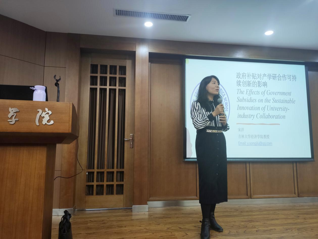 财政系举办本学期第一期学术专题讲座。财政系副主任、教授、博士生导师宋洋老师围绕她近期发表于SSCI一区《Technological Forecasting and Social Change》的论文《政府补贴对产学研合作可持续创新的影响》与财政系师生进行了学术分享并深入交流。
