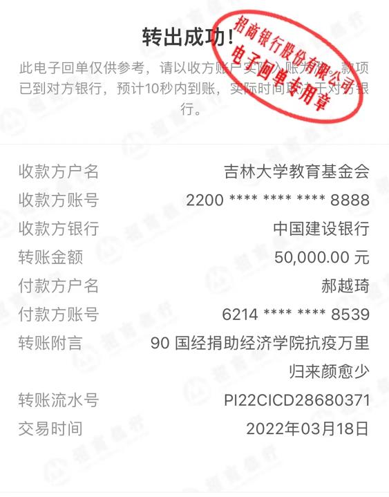 近日,新冠肺炎疫情持续蔓延,吉林大学防疫工作形势严峻,在防疫工作进入攻坚阶段的关键时期,社会各界人士和校友伸出援手,为学校捐款捐物,提供各项支持,其中茄子视频 1990级国际经济系校友为学校基金会捐资5万元专项用于茄子视频 防疫工作。