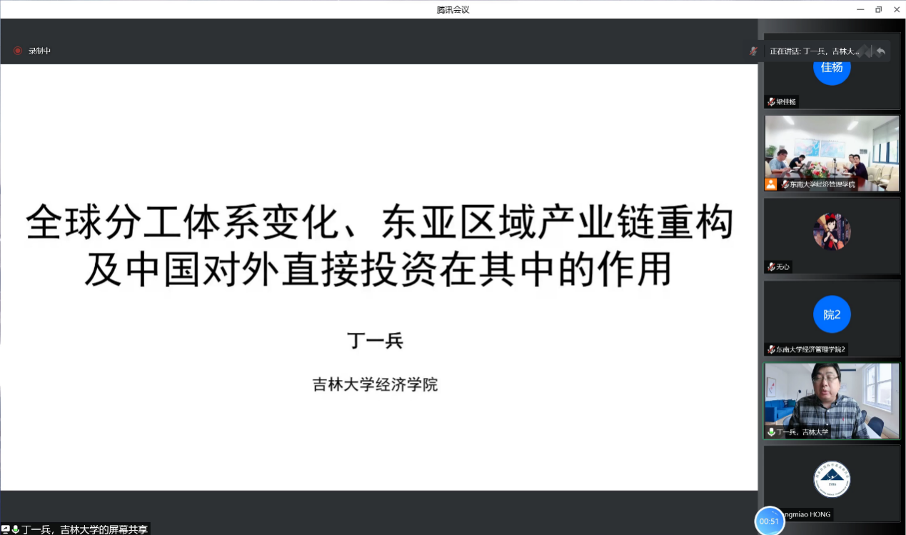 院长、中国世界经济学会副会长丁一兵教授、中南财经政法大学经济管理学院院长李小平教授等受邀作了主题演讲。丁一兵教授的主题演讲题为“全球分工体系变化、东亚区域产业链重构及中国对外直接投资在其中的作用”。