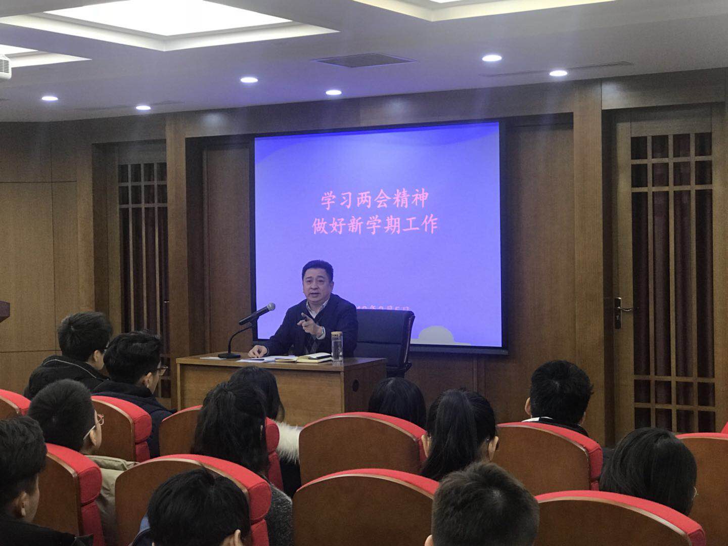 党委于2018年3月5日下午在东荣804会议室召开“学习两会精神、部署新学期工作”会议。学院各系主任、行政人员、本科生及研究生全体学生干部参加了会议,会议由党委书记陈密主持。