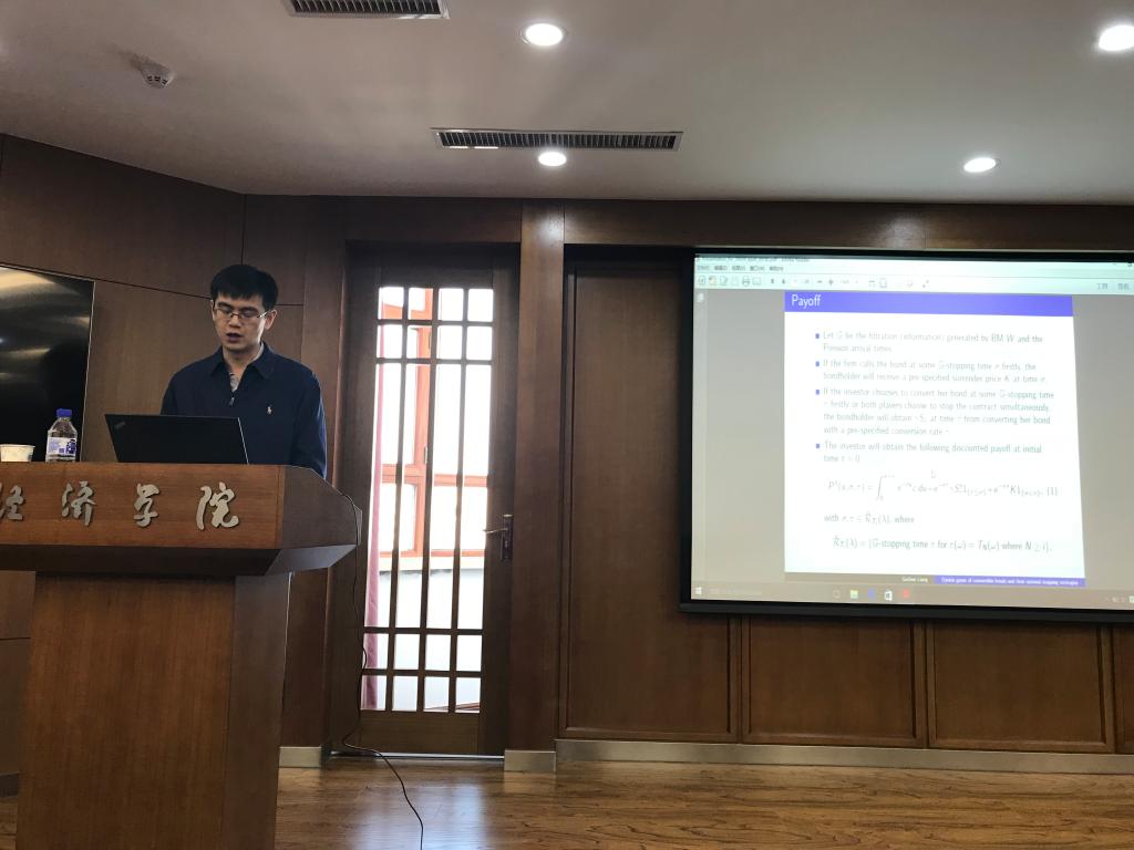 在报告开始前,史本叶副院长简要介绍了梁歌春博士的个人经历和学术成就,并对梁歌春博士回母校做学术报告表示热烈欢迎。梁歌春博士结合自己最新的研究成果,针对金融领域的可转换债券,阐述了可转换债券何时转换的最优问题,通过将债券的可转换时间和公司的赎回时间设为possion 停时,建立了Dynkin对策模型,并且讨论了三种条件下的最优转换策略。最后,梁歌春博士与参会的老师和同学们就相关问题进行了深入交流。