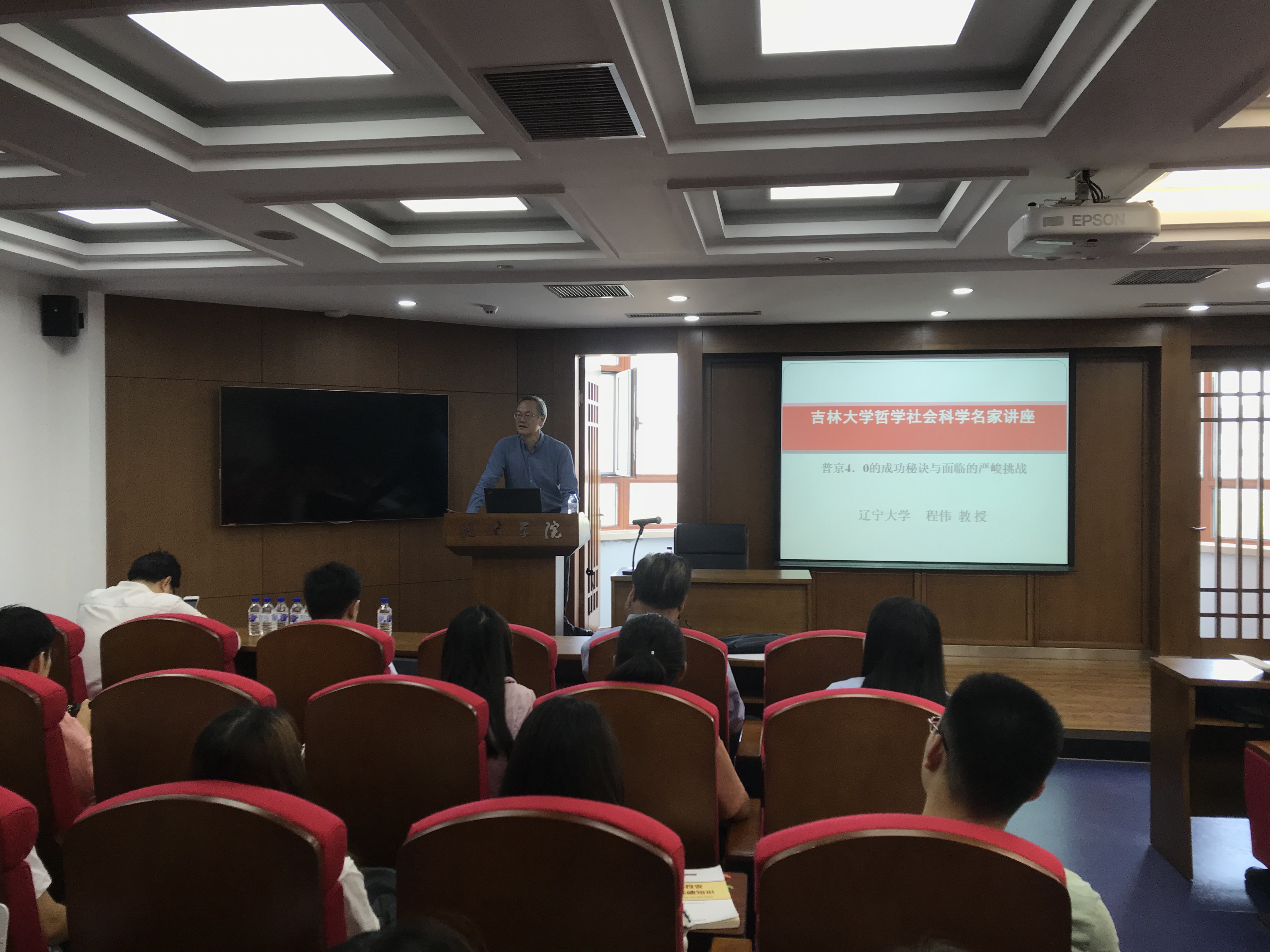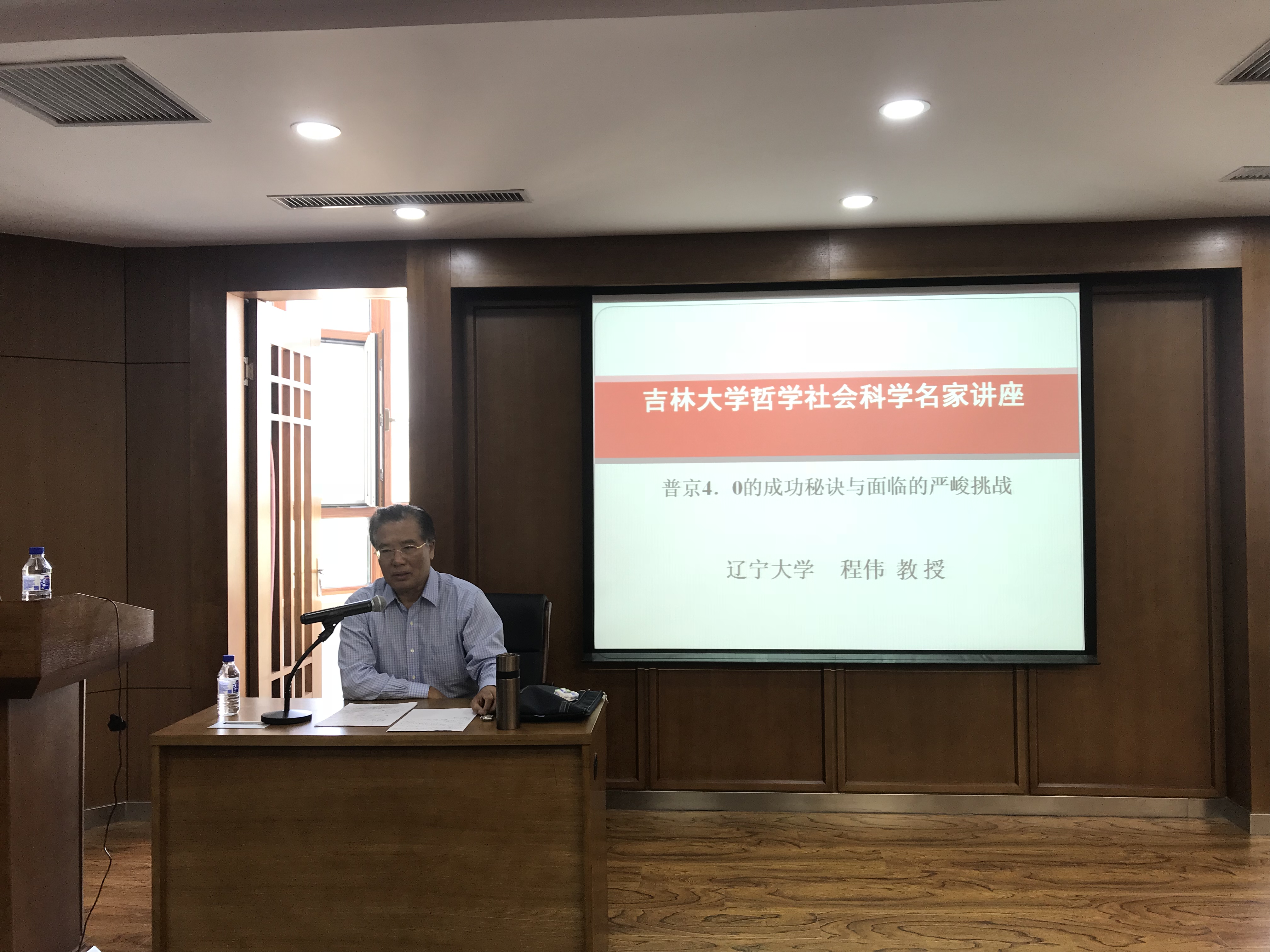 向程伟教授、李坤望教授表示热烈欢迎,并向大家介绍了两位教授的学术成就。随后,程伟教授结合自身近期参加的学术会议,回顾总结了普京执政1.0、2.0、3.0的历史及成绩,分析了普京再一次成功当选的原因,重点论述了俄罗斯国家利益的内涵所在,以及普京的执政思想理念。然后,程教授结合俄罗斯现阶段面临的各种困难挑战,他认为在普京4.0时代俄罗斯只有大力发展经济这一唯一选择。如果在这个任期内俄罗斯实现了经济发展,那普京将会载入俄罗斯的史册;反之,普京之前的所有举措都将可能遭受质疑。最后,谈到未来的中俄关系时,程教授认为只有经济上强大的中国与军事上强大的俄罗斯深化合作,才能抵御复杂多变的国际政治经济形势,实现共赢。因此,中俄双方未来应坚定不移的增强互信与合作。