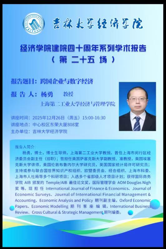 杨勇,博士,博士生导师,上海第二工业大学教授。曾任上海市闵行区经济委员会副主任(挂职);曾担任英国萨塞克斯大学副教授、准教授,英国埃塞克斯大学讲师,英国伦敦布鲁内尔大学研究员,英国国家统计局许可研究员;主持或参与联合国世界知识产权组织、欧盟委员会、经合组织、上海市科委、上海市人社局等多个科研项目;入选多个省部级人才项目计划;获得国际商务学院AIB颁发的Temple/AIB最佳论文奖,国际管理学会AOM Douglas Nigh奖等。现担任International Journal of Finance & Economics、Journal of Economic Surveys、Journal of International Financial Management & Accounting、Economic Analysis and Policy期刊副主编,Oxford Economic Papers、Economic Modelling期刊客座编辑,International Business Review、Cross Cultural & Strategic Management期刊编委。