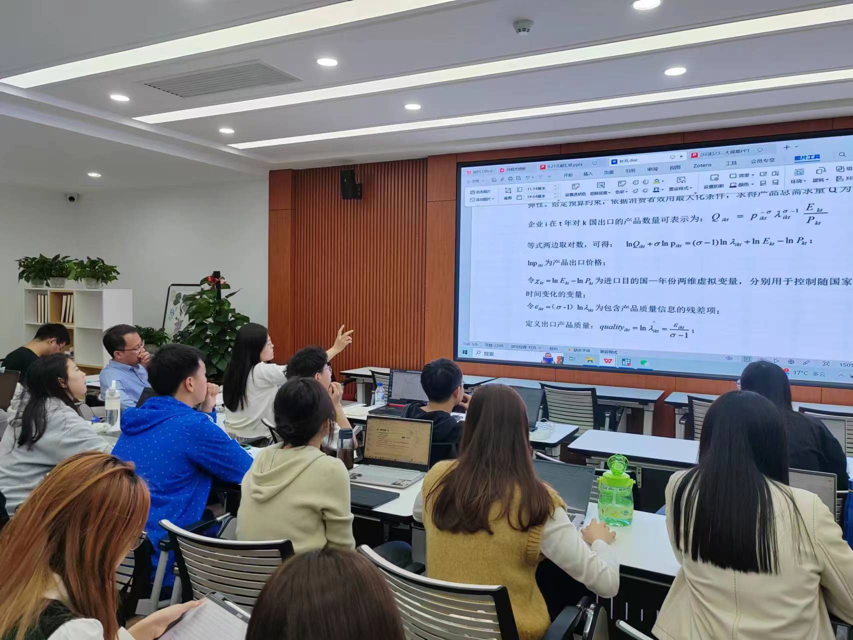 本次活动主题为“美国加征关税如何影响了中国产品出口”,汇报人从引言、文献综述、理论模型等八个方面对文献进行了详尽的解读并给出了自己的理解和推导过程。围绕这一主题,参加活动的师生就研发投入函数中参数β和质量z的关系、计量模型中是否有必要加入时间趋势变量等问题展开了开细致的讨论,参加学习的拔尖基地班(匡亚明实验班)同学也参与到讨论中来,现场气氛非常活跃。