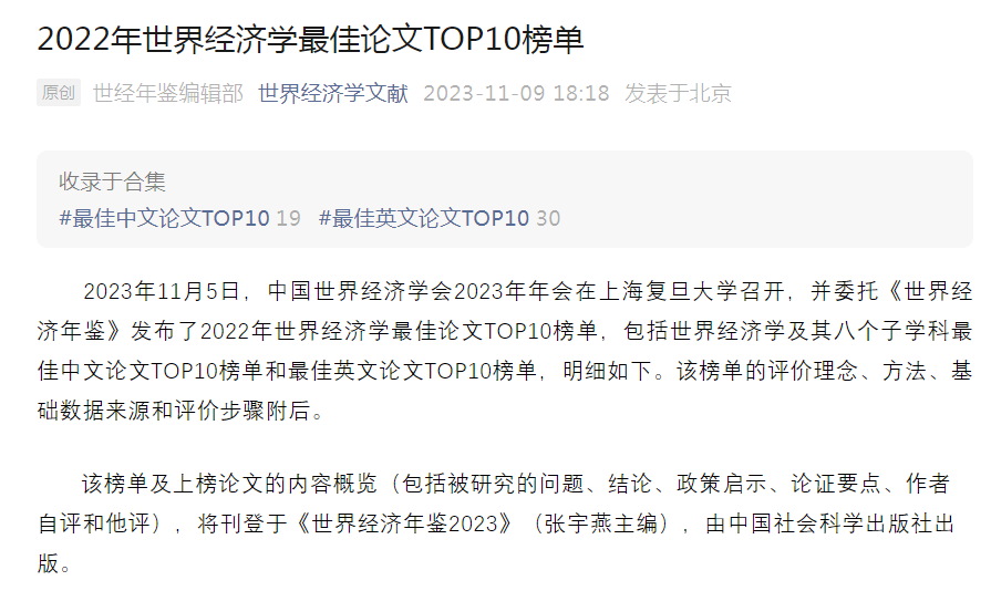 2023年11月5日,在复旦大学召开的中国世界经济年会上,中国世界经济学会委托《世界经济年鉴》发布了2022年世界经济学最佳论文TOP10榜单,包括世界经济学及其8个子学科最佳中文论文TOP10榜单和最佳英文论文TOP10榜单。我校茄子视频