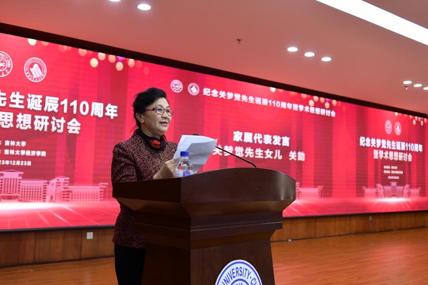 纪念会上,丁一兵介绍了关梦觉先生的生平。随后,宋冬林作为教师代表发言,他分别从“经济学家”与“教育家”的角度回顾了关梦觉先生浩然正气的一生,并表示“新时代学术工作者、广大青年都应当追随先辈足迹,不忘初心使命,努力把教学科研搞上去,把学科建设搞上去,这才是对先生最好的祭奠”。关劼对现场所有参会的来宾表示感谢,从作为家属的所见所闻分享了关梦觉先生的生平点滴,并对吉林大学以及教师、学子表达了殷切祝愿。