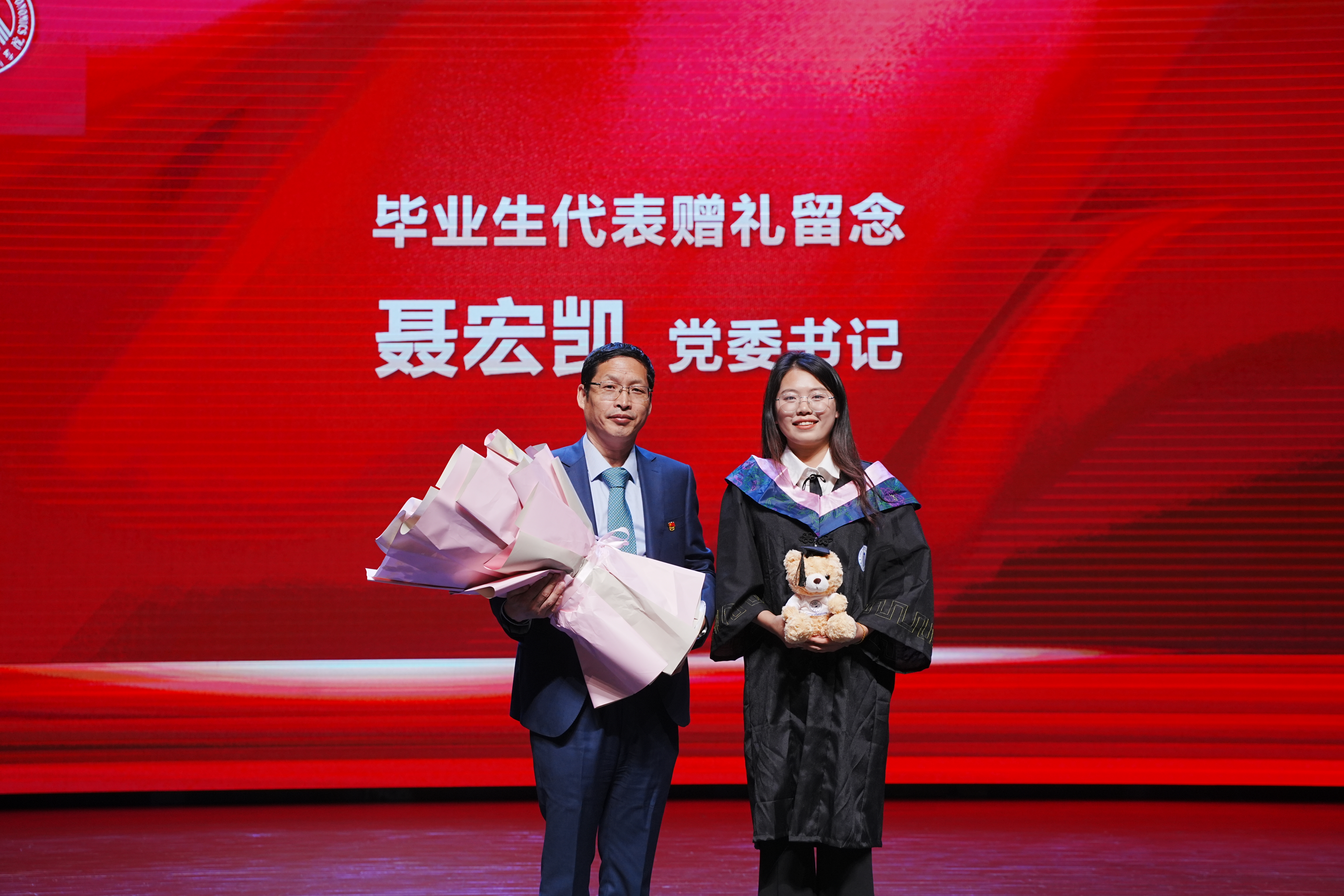 党委书记聂宏凯向毕业生代表张傲千同学赠礼留念。