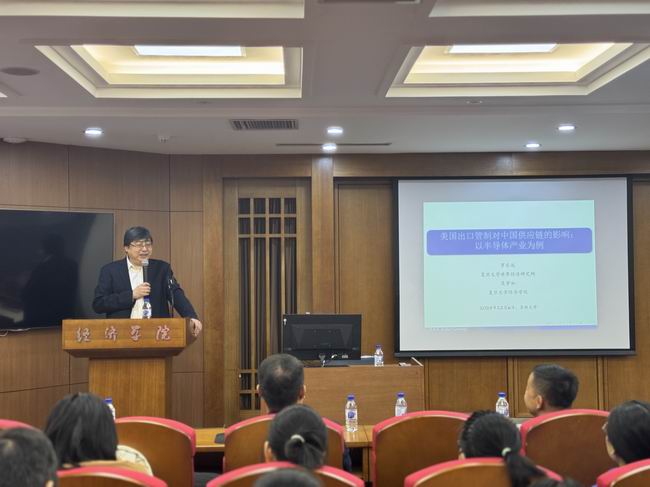 作题为“美国出口管制对中国供应链的影响:以半导体产业为例”的学术报告。茄子视频