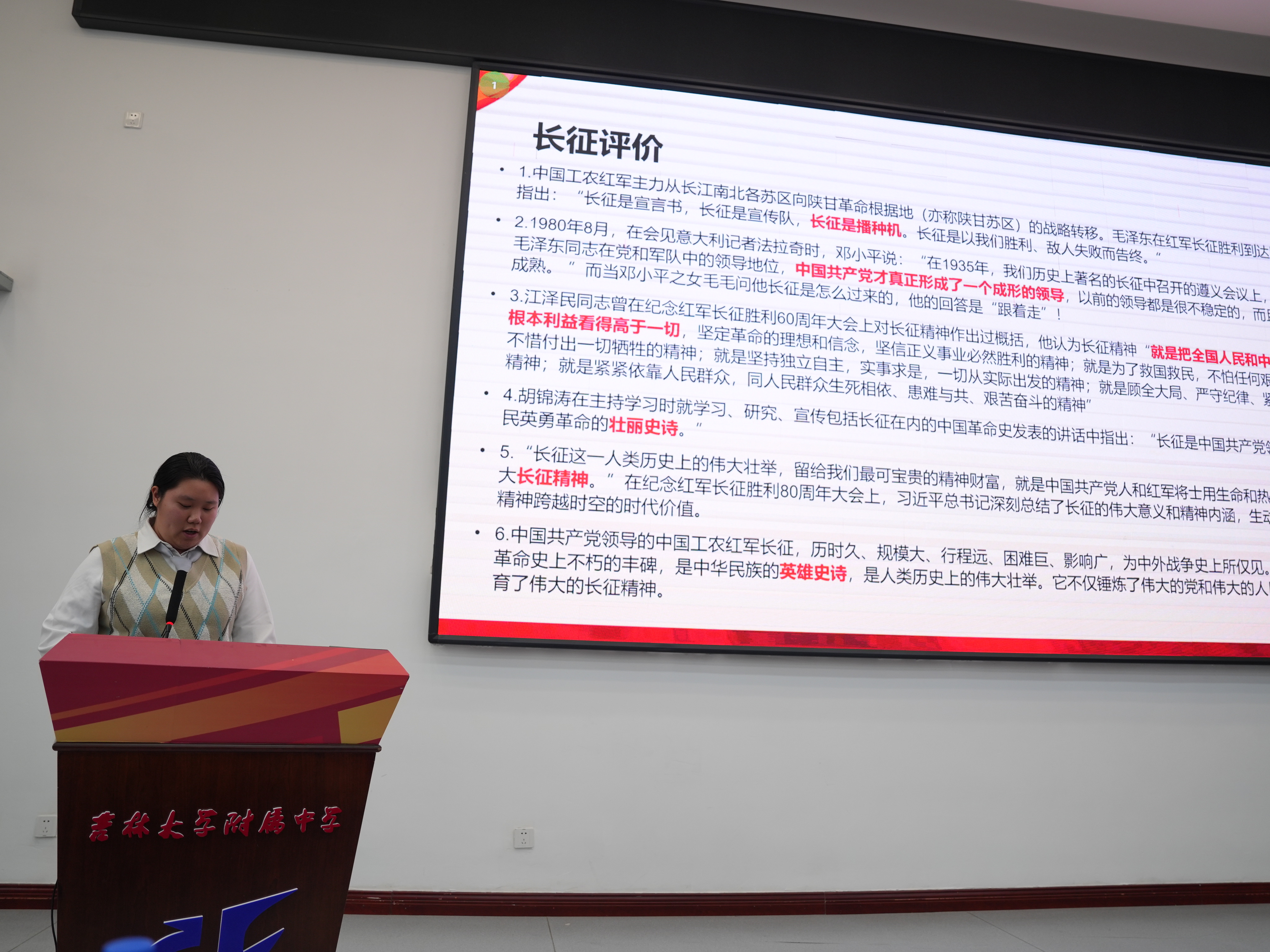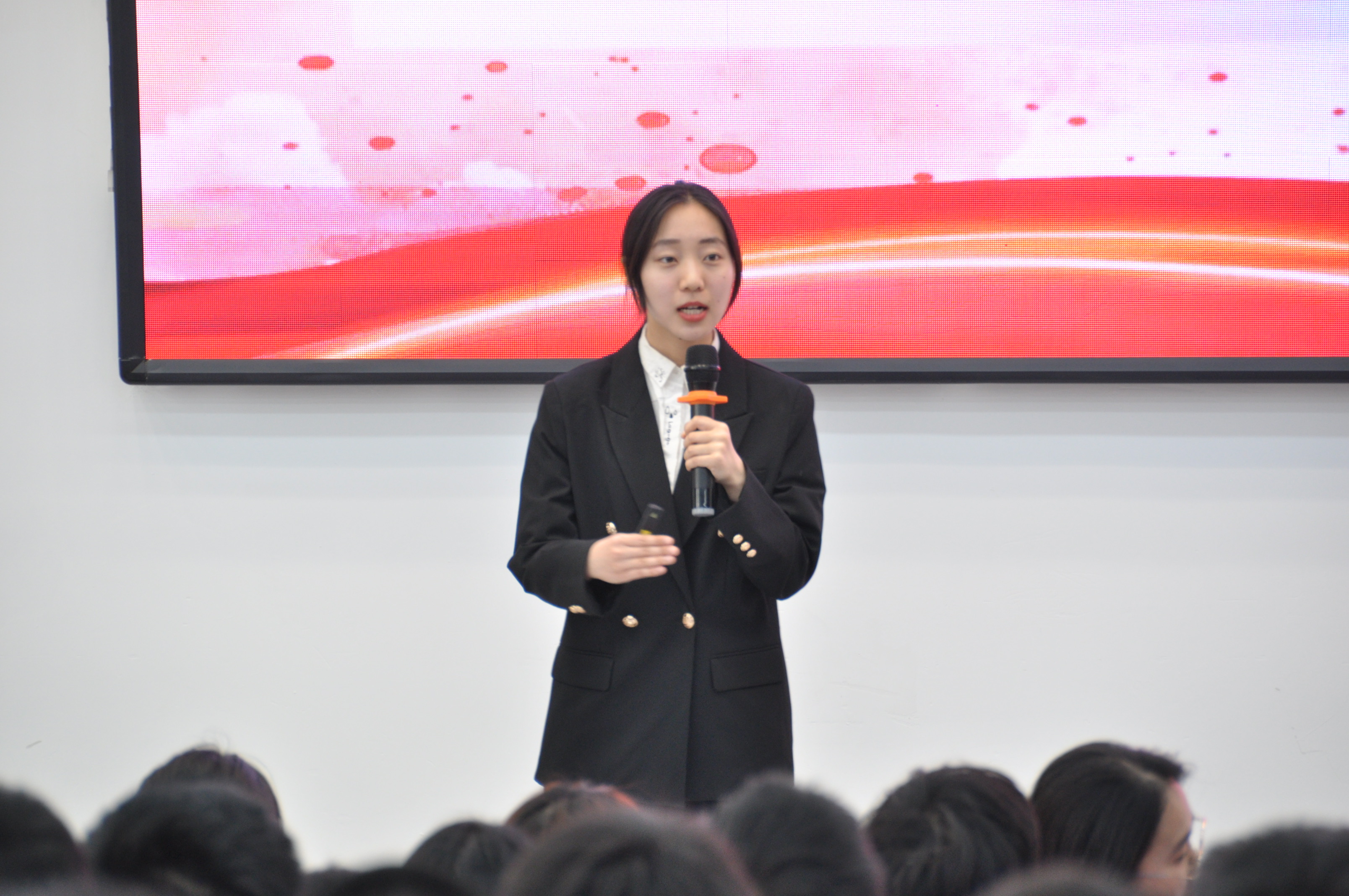 在团课内容环节,初翎宣讲团成员们精心准备、各展风采。初翎宣讲团团员王一帆给同学们讲述了习主席的知青岁月,“梁家河的窑洞依然静默,但那里诞生的精神火炬,正照亮着新时代的征程。当我们凝视那位知青用过的煤油灯,看到的不仅是斑驳的岁月痕迹,更是一个民族永不褪色的精神密码——以人民为师,与大地同行。”七年下乡耕耘,百年党业创新。她用习主席七年知青的故事,引导学生们深入感悟到习主席那高瞻远瞩的战略眼光和求真务实的工作作风。号召同学们以习近平总书记为榜样,在新时代勇担使命,为中华民族伟大复兴的中国梦奉献自己的青春力量。