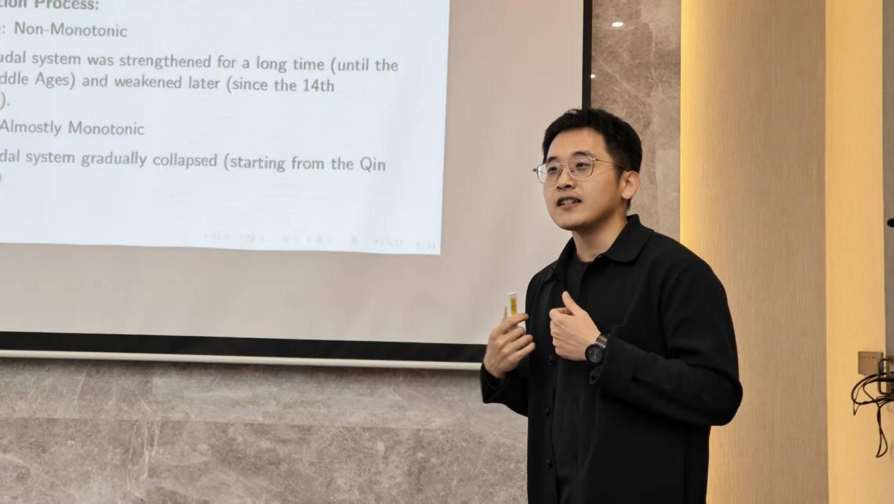 张宇飞老师以“两种不同的集中化:中西方大分流比较研究”为题,构建了一个文化—政治—技术动态演化模型,并阐释了中国与欧洲经济分流的深层机制。他提出,稻作农业的高基础设施回报推动中国走向以集体主义文化为支柱的“文化型集中化”;而欧洲因麦作农业的低基础设施回报保留个人主义文化,最终走向以技术创新为动力的“技术型集中化”。