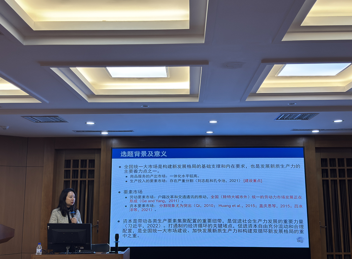 报告伊始,吕越教授系统介绍了数字经济如何重塑资本跨区域流动的规模、模式与方向。随后,吕越教授介绍到,她及其研究团队基于2009-2019年上市公司母子公司数据构建了城市数字经济发展指数,并运用多维固定效应模型与工具变量法识别数字经济对资本流动的非对称性影响。在此基础上,吕越教授就该研究提出的三个假说及其检验结论进行细致讲解。最后,吕越教授进一步指出,数字经济发展在促进资本流动的同时,也受地理距离、行政边界与市场规模等因素的调节,该研究结论为理解数字经济时代的资本配置逻辑提供了微观证据,也为区域协调发展与全国统一大市场建设提供了政策参考。报告结束后,吕越教授简要介绍了中文核心期刊《国际贸易问题》的发展概况、重点选题方向与选稿流程。