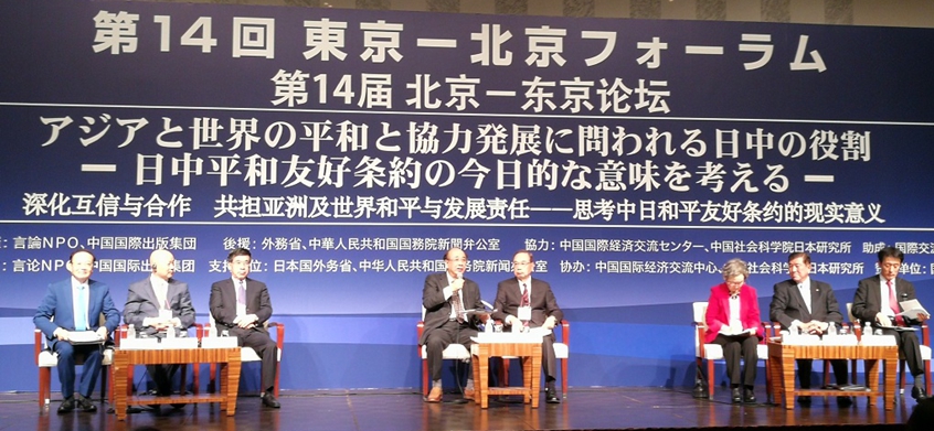 10月14-15日,主题为“深化中日互信、共担亚洲及世界和平与发展责任——思考中日和平友好条约的现实意义”的第十四届“北京-东京论坛”在日本东京举办。中共中央宣传部副部长、国务院新闻办公室主任徐麟,国务院新闻办公室原主任赵启正,中共中央对外联络部原副部长刘洪才,中国驻日本国特命全权大使程永华,中国国际交流中心副理事长、商务部原副部长魏建国,中央外办原副主任、空军原副司令员陈小工,中国外文局副局长方正辉,中国军事科学院高级智库学术委员会委员、中美防务关系研究中心主任姚云竹,中国军控协会理事、国防大学战略研究部原主任朱成虎,中国石油化工集团原董事长傅成玉,中国经济体制改革研究会副会长樊纲,以及日本国前内阁总理大臣福田康夫,联合国前副秘书长明石康,日本内阁官房副长官西村康稔,前外务大臣川口顺子,前防务大臣中谷元,前日本国驻中国大使宫本熊二,现众议院议员石破茂,日兴研究中心理事长,日本银行前副行长山口广秀,大和总研理事长、日本银行前副行长中曾宏,环日本海研究机构代表理事、亚洲开发银行研究中心前主任河合正弘等中日两国各界人士和400余名中日学者参加论坛。