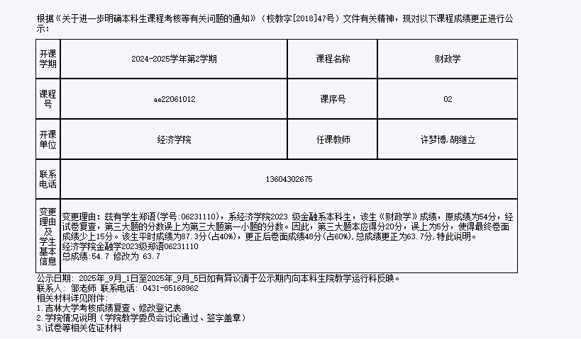 关于茄子视频 2023级郑语同学财政学课程成绩更正的公示