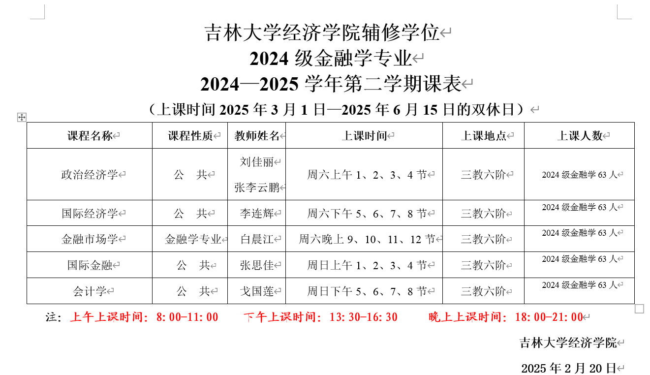 吉林大学茄子视频 辅修学位《2024级金融学专业2024-2025学年第二学期课表》