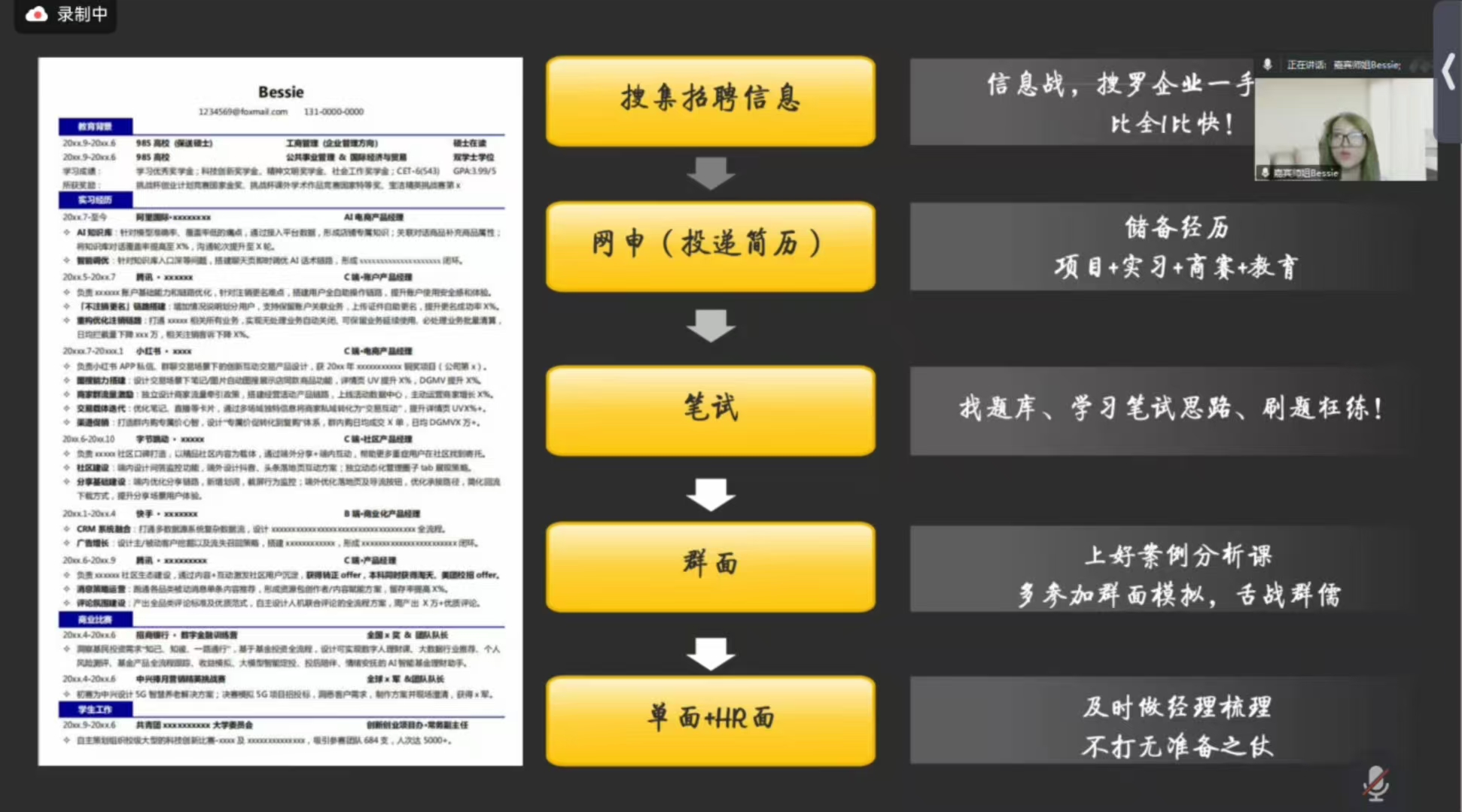 Bessie师姐则从实践角度分享了她的成功经验。她详细阐述了互联网实习经历、商赛和互联网商业项目对自身储备的重要性。并且特别强调了我们在挑选实习的时候要优先选择大平台,同时建议同学们在实习时以正式员工的标准严格要求自己,保持积极主动的学习态度。关于商赛,Bessie师姐指出这是快速提升能力、提前锁定offer的有效途径。而商业项目经历则是展示个人能力的重要“敲门砖”,并举例解释项目应如何开展和优化。