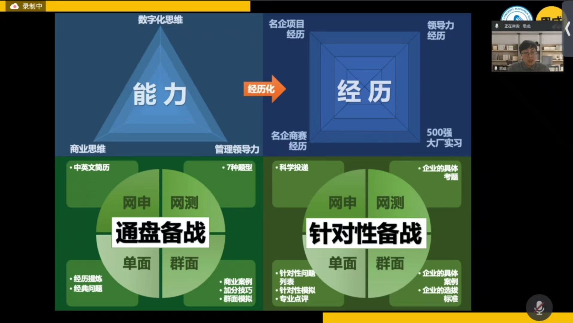 在随后的补充分享环节,孔翔老师进一步讲解了顶尖名企的选拔标准、往届毕业生的求职备战时间规划以及网申、网测、群面、单面等环节的能力提升方法。