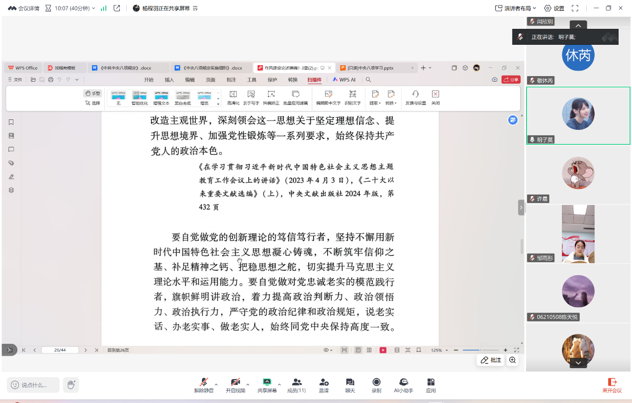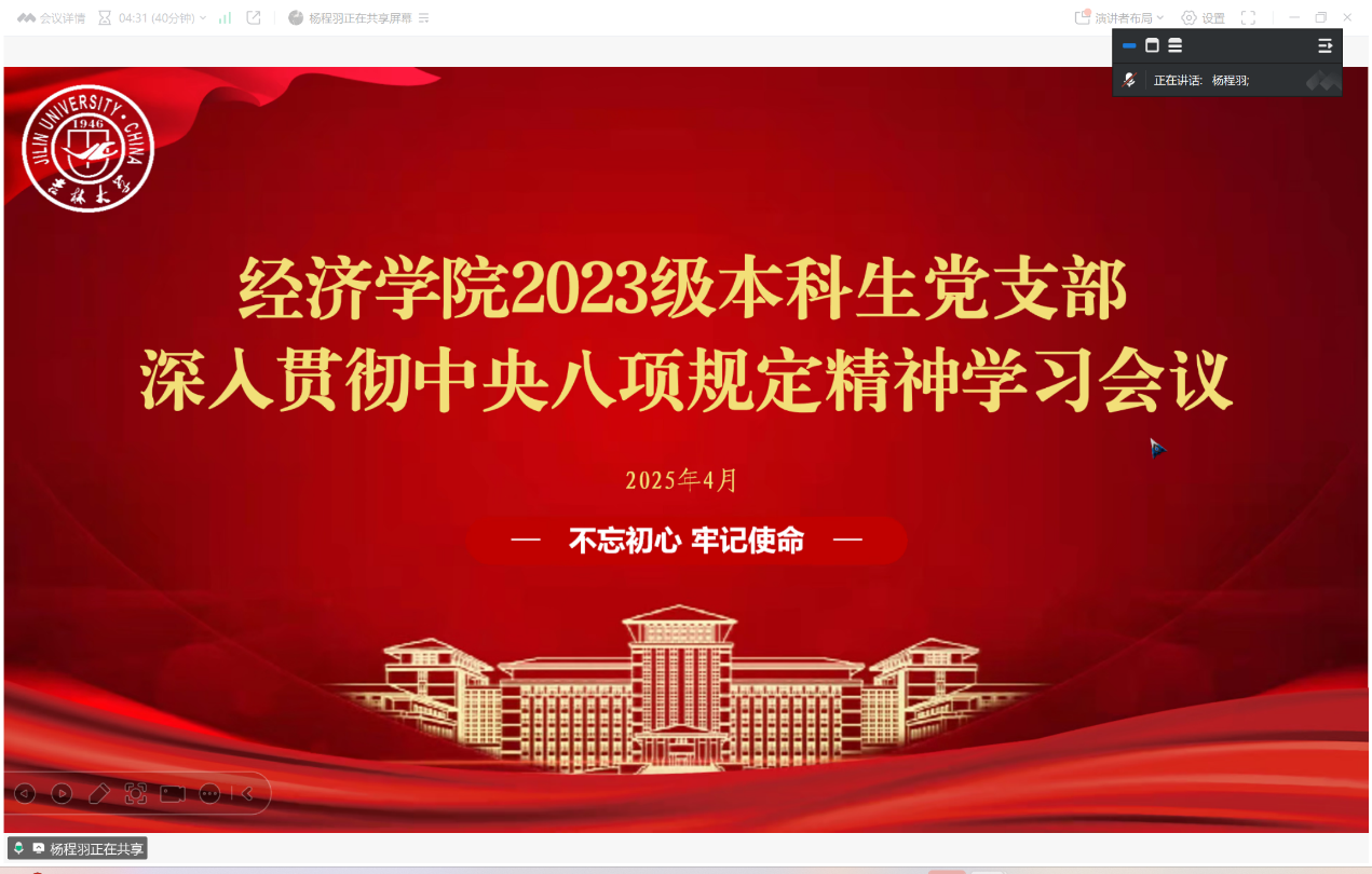 2023级本科生党支部在党支部书记邹雨彤同志的精心组织下,于2025年4月14日下午召开党员大会,全体党员共同参与此次深入贯彻中央八项规定精神学习教育活动。